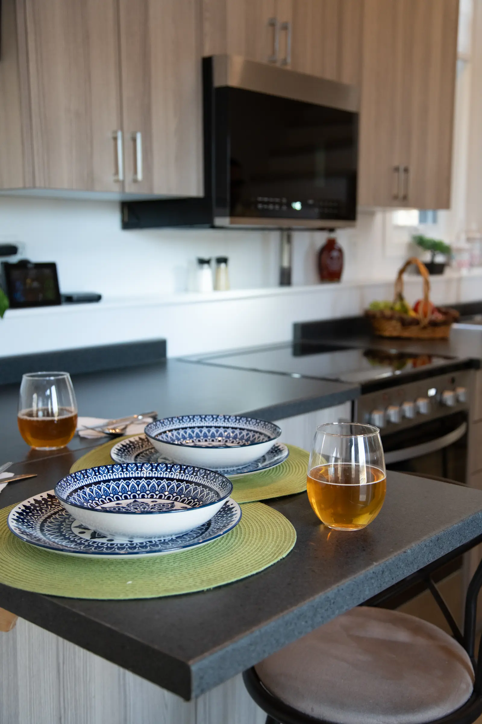 Full-size refrigerator, electric range, dishwasher, and over-range microwave. Ample counter space and cabinet storage. Stainless steel finish throughout.